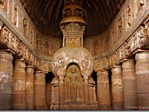 Ajanta caves include paintings and sculptures described by the Archaeological Survey of India as "the finest surviving examples of Indian art" Also the caves are UNESCO World Heritage Site. There are 30 caves in Ajanta of which 9, 10, 19, 26 and 29 are chaitya-grihas and the rest are monasteries. These caves were built up in the earlier 2nd century BC to AD. All paintings shows heavy religious influence and centre around Buddha, Bodhisattvas, incidents from the life of Buddha and the Jatakas. The paintings are executed on a ground of mud-plaster in the tempera technique. Ajanta Caves are just 55 kms from Jalgaon city and 105 kms from Aurangabad.